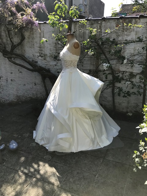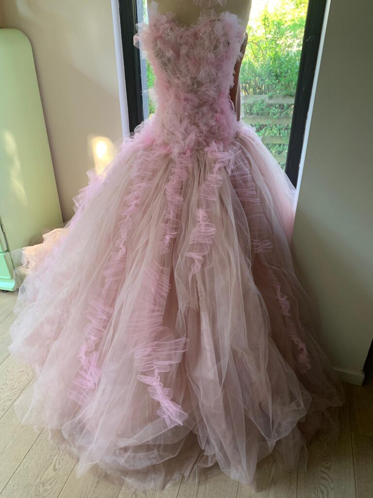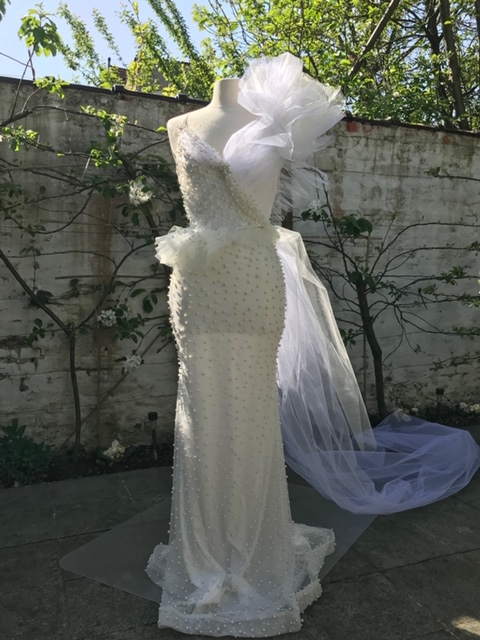 ベルギー人デザイナー、ジュリー・ルブランのこだわりが詰まったデザイン。ギリシャの青空に映える純白のドレスが並ぶ中、ピンクの華やかなドレスも個性が光る。