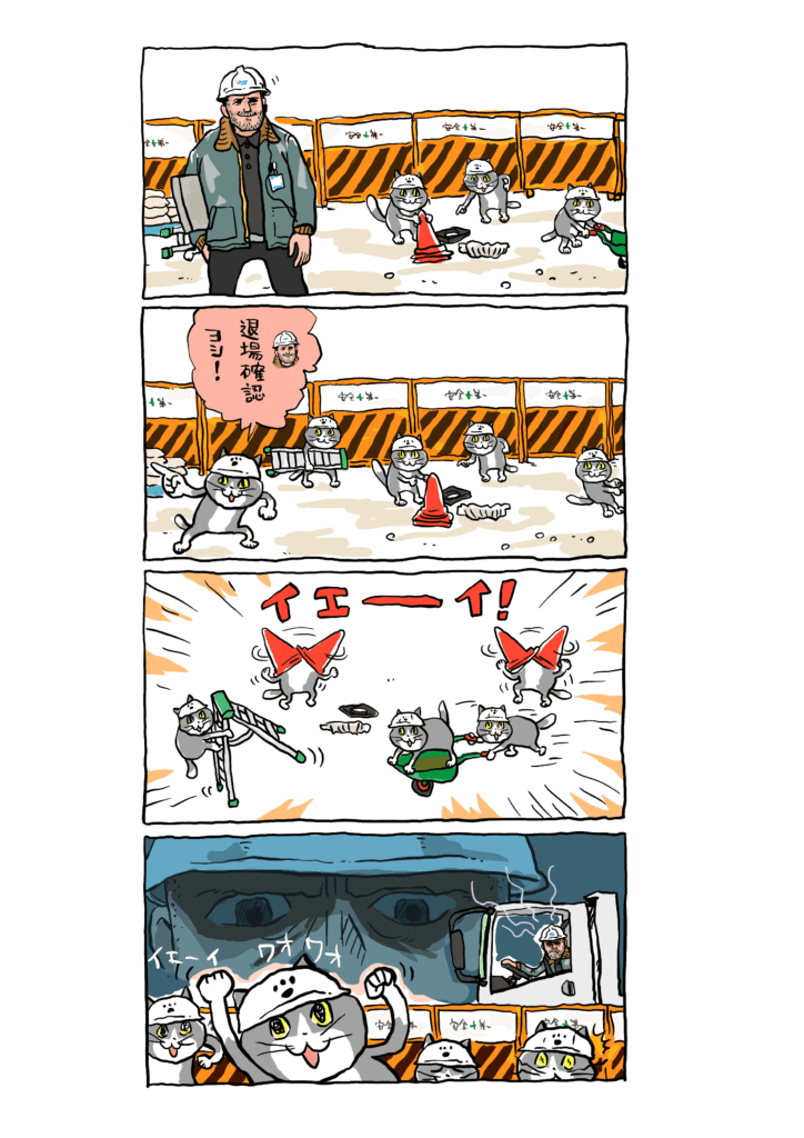 さらに、4コマ漫画には、ステイサムが監督する建設現場で真面目に働く仕事猫とその様子に笑みを浮かべるステイサム。ところが、ステイサムがいなくなったのを確認すると現場の道具で遊び出す仕事猫たち。そんな様子をしっかりと発見したステイサムの怒りのオーラに仕事猫たちは気付けるのか…!?
