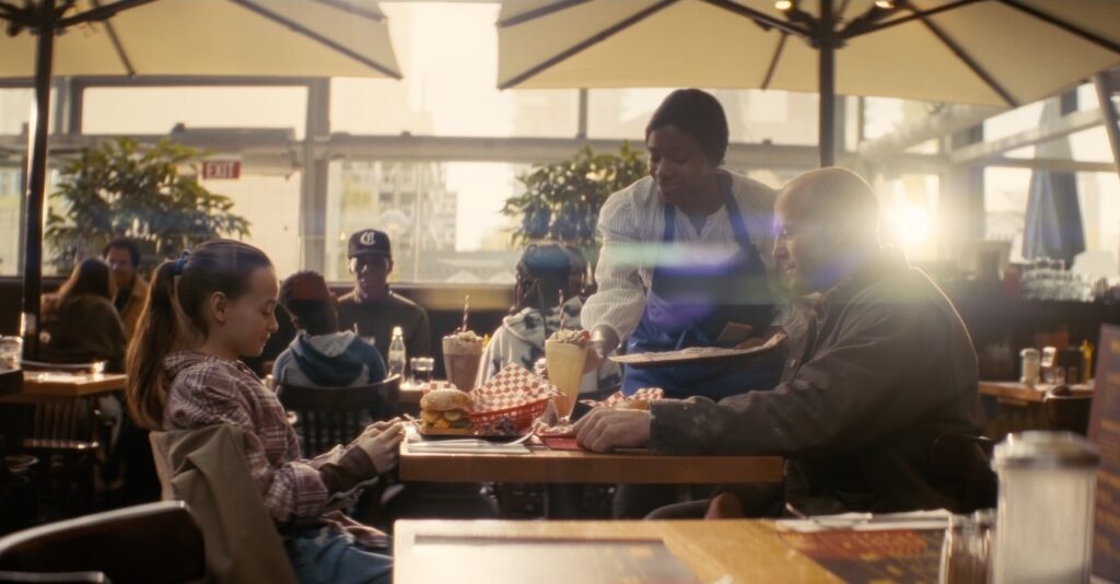 建設現場では、頼れる現場監督として従業員を鼓舞するステイサムと、そんな彼の言葉を熱心に聞く部下たちの姿が映し出されておりステイサムの仕事ぶりが窺えるカットとなっている。一方で大切な一人娘の前ではハンバーガーやミルクシェイクを一緒に楽しむ優しいパパとして穏やかな時間を過ごすステイサムの微笑ましい一面を見ることができる。