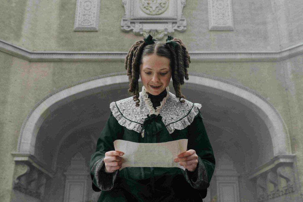 今回解禁された本編映像は、王子の城で行われる舞踏会への招待シーンから始まる。好奇心を抑えられずに使者のもとに行くエルヴィラ(リア・マイレン)。義姉妹のアグネスは、貴族の出自を誇るように「アグネス・アンジェリカ・アリシア・ヴィクトリア・フォン・モルゲンスティルネ・ムンテ・オブ・ローゼンホーフ」と長い名前を告げるも、エルヴィラには名乗る姓がない。