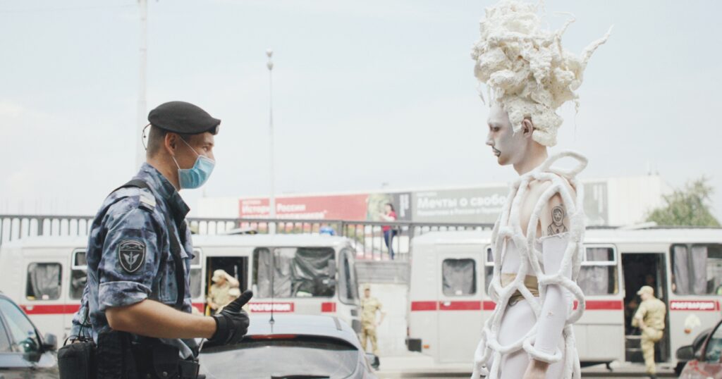 今回解禁された本予告は、真っ白にメイクアップされた顔に唇周りの黒色が鮮やかに映えるジェナ・マービンが「ジェナとは、“存在”かな」と静かに語る場面からスタートする。アーティスト・ジェナ(本名:ゲンナジー・チェボタリョーワ)は、「これまで受けてきた苦痛を自分のアート表現に応用してる」と、LGBTQ+への弾圧が激化する社会の中で必死に戦う胸の内を明かす。