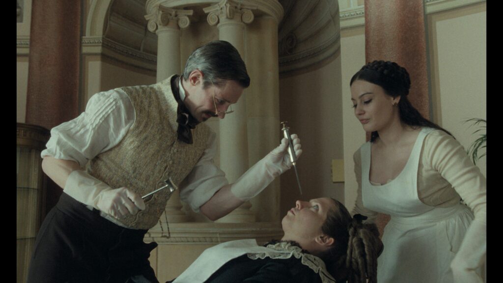 二つ目は、デカ目にするための施術。医師の「ゴージャスな美女になる」の一言に続き、麻酔なしで瞼に直接針と糸でつけまつ毛が縫い付けられる。それを見つめる看護師の瞳は不気味に白濁しており、エルヴィラの苦悶のうめきが響くのだった。