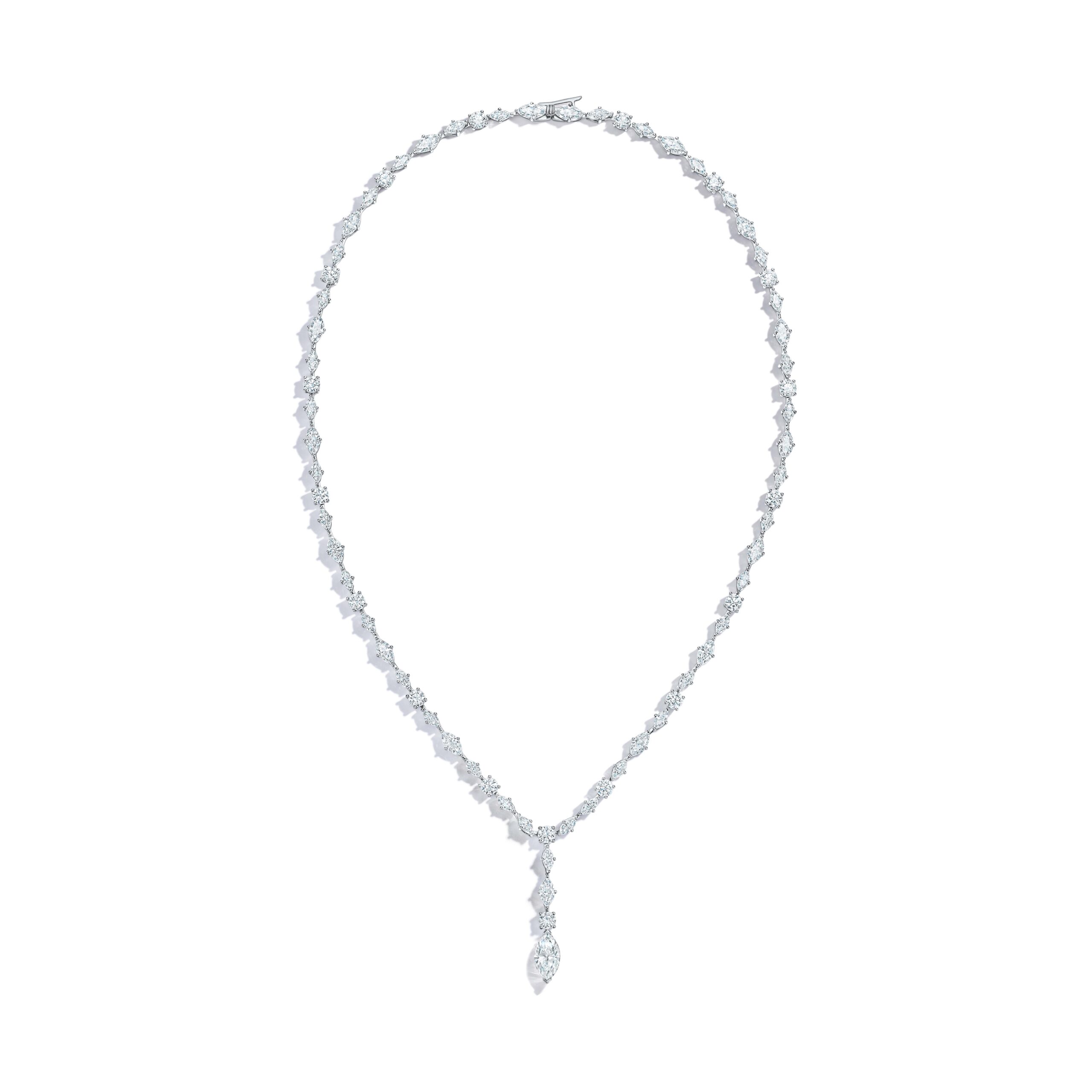 ペンダントには14カラット以上のダイヤモンドと、エレガントなマーキス ダイヤモンドがあしらわれている。18カラット以上ものダイヤモンドを使用したピアスとリングとのコーディネートで、彼女の美しさをさらに引き立てた。