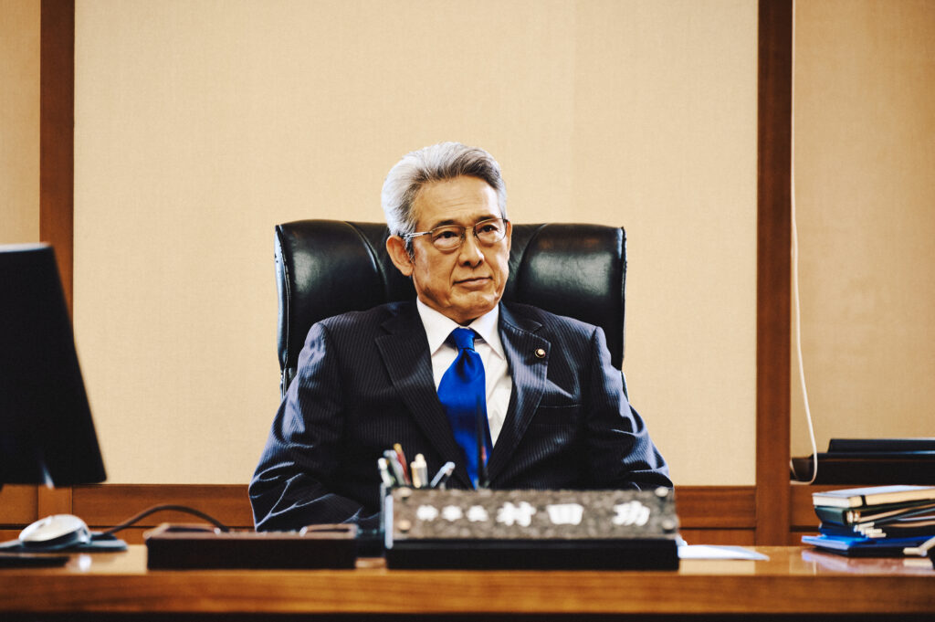 さらに、堂々たる姿で鎮座するのは鶴見辰吾演じる民和党・幹事長。国家レベルの陰謀を操る黒幕の風格を感じさせるカットとなっている。